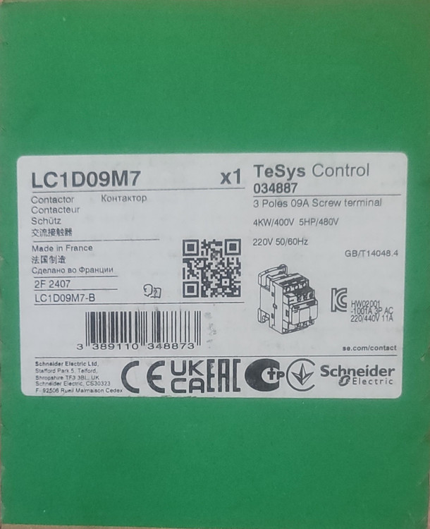 کنتاکتور 9 آمپر اشنایدر مدل LC1D09M7 بوبین ۲۲۰ولت