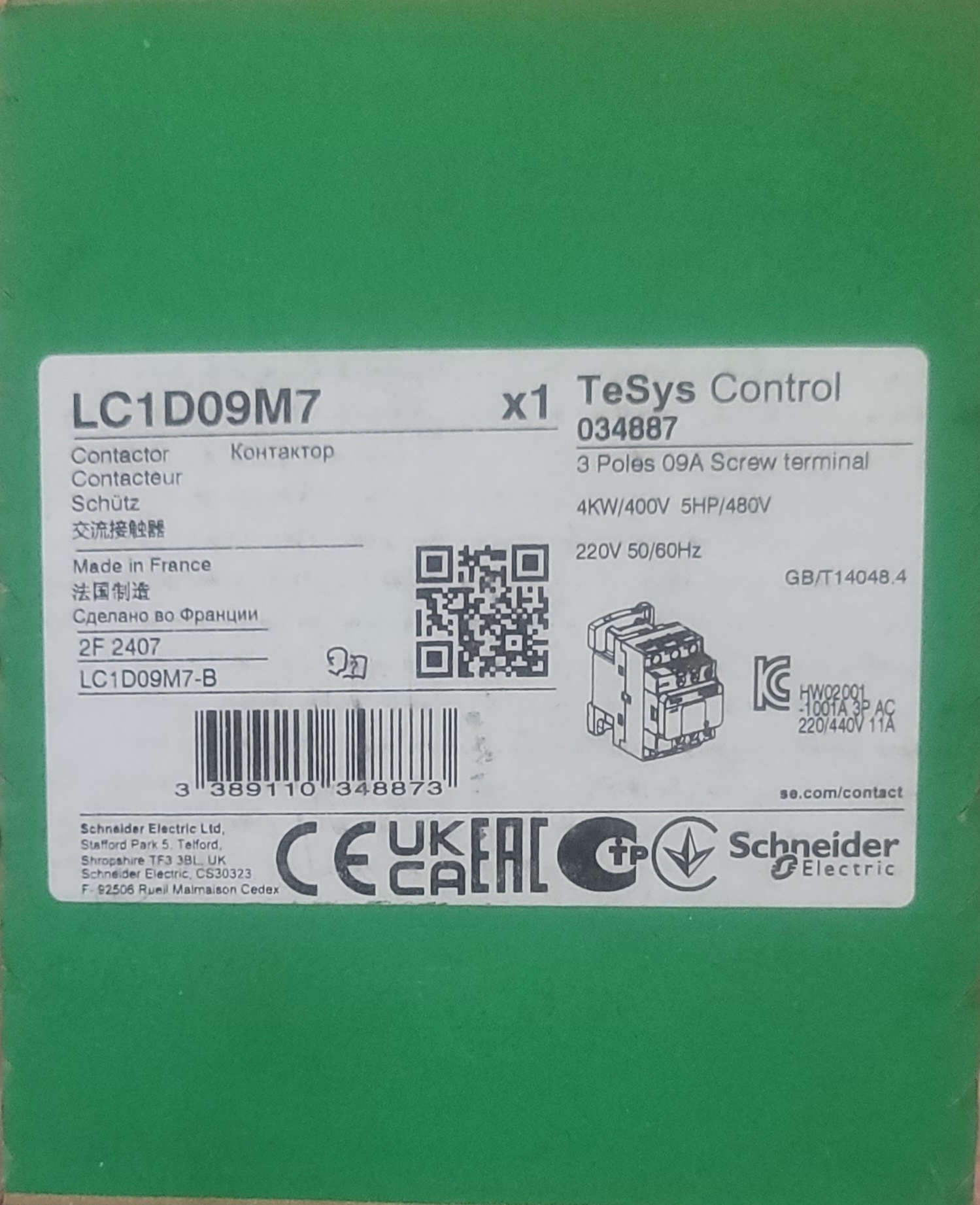 LC1D09M7-Contactor , TeSys Deca 3P(3NO) AC3/3 9A